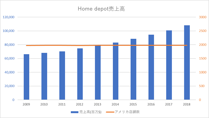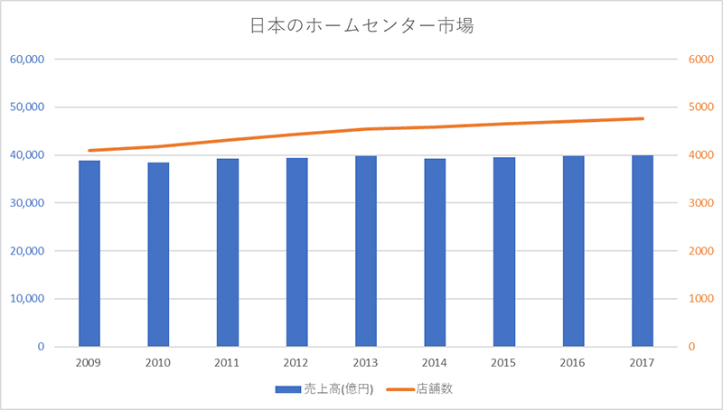 店舗数がほとんど変わらずに売上が上昇していることが明確です。比較として、日本のホームセンターを同じ形式(縦軸の目盛りは違います)でグラフにしてみました。