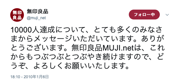 無印良品がTwitterアカウントを開設したのは2009年10月末。当時はまだ日本国内で積極的にTwitterを活用している企業が少なく、先行者利益もあって2カ月強でフォロワー1万人を突破した。ただし、企業がソーシャルメディアを利用することが当たり前のようになった現在では、1万人のフォロワーをオーガニック(広告の利用無し)で獲得することは、それなりの期間が必要なはずだ。