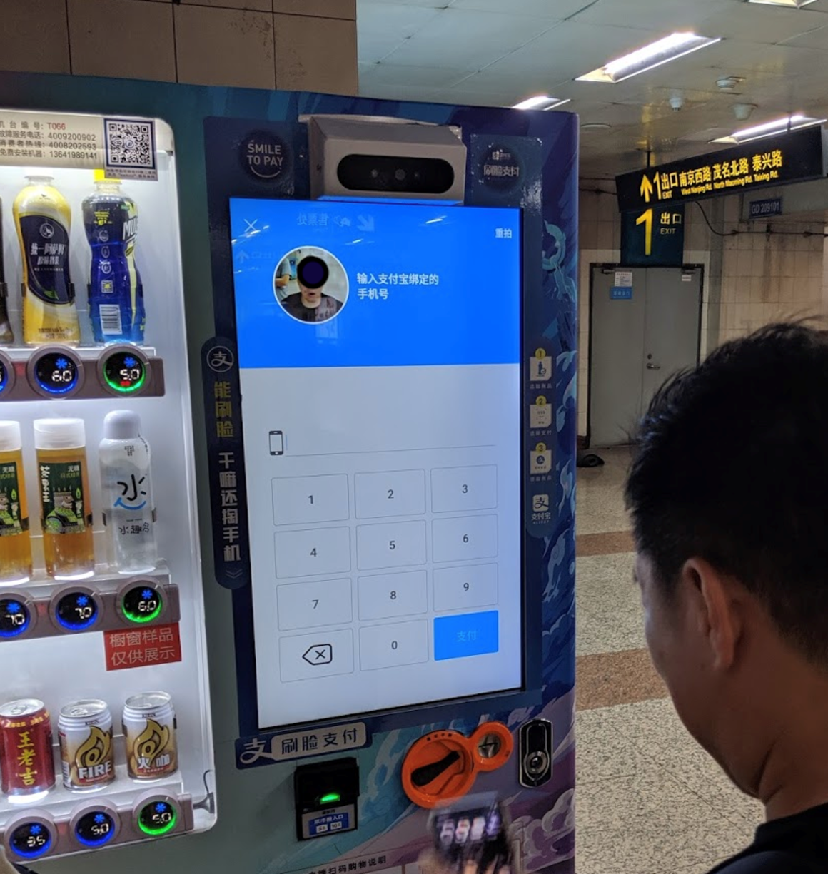 自動販売機でも顔認証が導入されていました。ちなみに顔認証ができなかった(一致する人物がいなかった)場合は、携帯番号をフル入力し、SMSにワンタイムパスワードが送られてくることで認証できます。