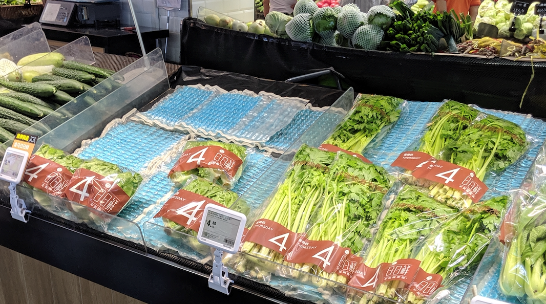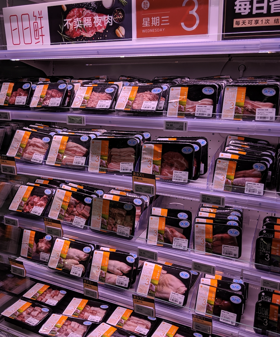 1枚目の写真は「盒馬鮮生king88店」の精肉コーナーで水曜日に撮ったもので、2枚目の写真は「盒馬菜市業態1号店」の野菜平積みコーナーで木曜日に撮ったものです。