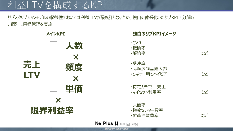 サブスクリプションモデルの収益性においては利益LTVが最も肝となるため、独自に体系化した「サブKPI」に分解し、個別に目標管理を実施しています。