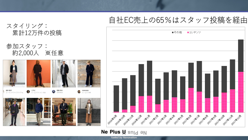 社内には反対意見も多かったが、一気に行いました。さらに、店頭のスタッフなどがコーディネート例を投稿できるようにしました。その結果、1年4カ月ほどで自社 EC の売上におけるスタッフ投稿コンテンツ経由の割合が65%になり、販売員が接客だけでなく PR もまかなうという役割を満たすようになりました。