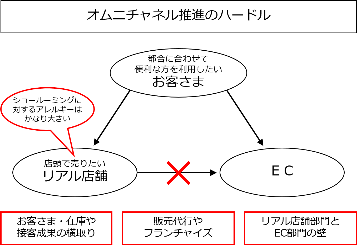 - リアル店舗側の「自分たちの接客活動の成果がECに横取りされる」ことに対するアレルギー