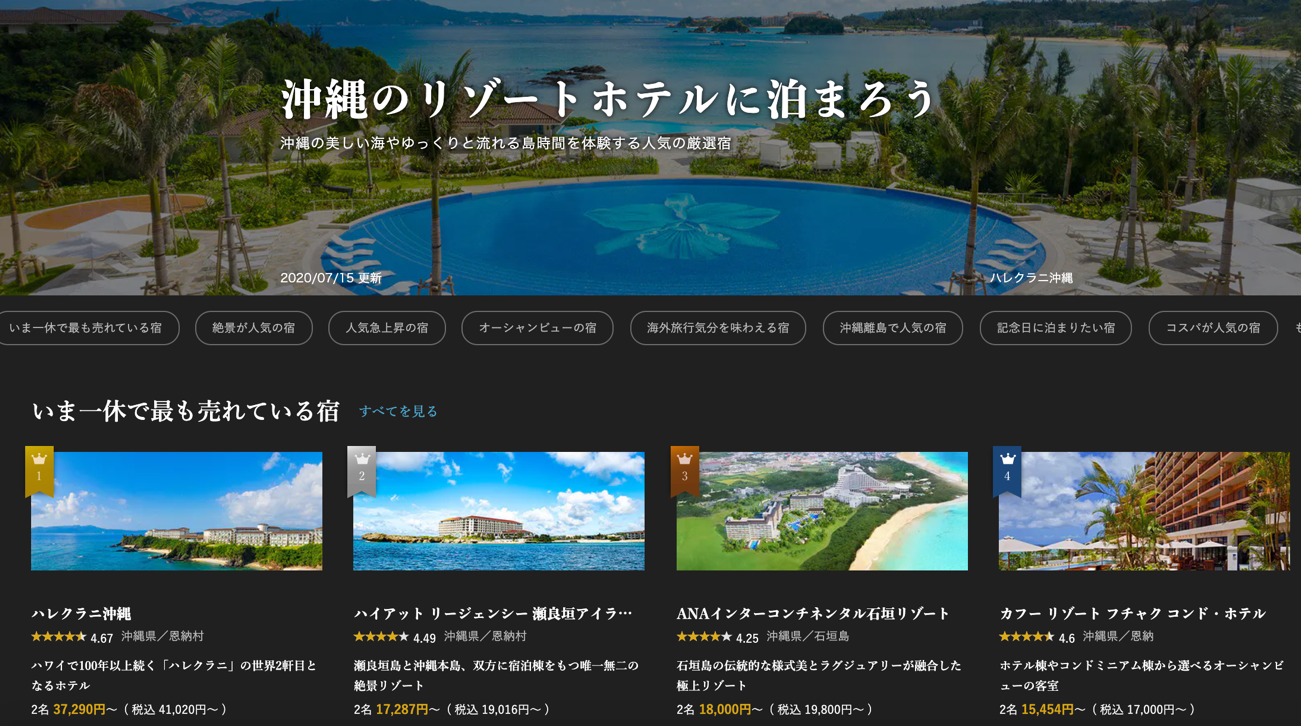 さらに、Googleに打ち込む検索キーワードが異なれば、遷移した一休.comのページで表示されるテーマも変わる。「沖縄 ホテル」であれば、「オーシャンビュー」や「海外旅行気分が味わえる宿」、「沖縄本島で人気の宿」などが表示される。これはエリアや施設のジャンルによって、ユーザーが求めるニーズが異なるからだ。