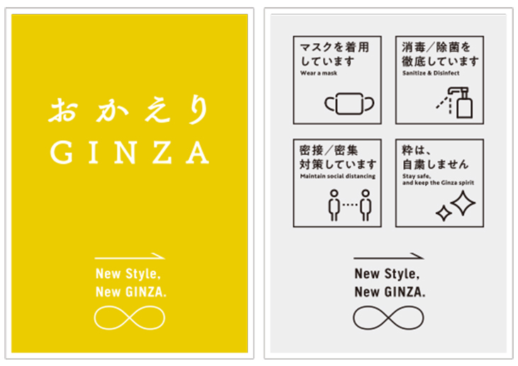 そのオリジナルロゴをあしらったのれんと、まずしっかりとコロナ対策を行ったうえでお客さまを迎えるという意思を示すために、「おかえりGINZA」のコピーと対策の内容をアピールするポスターを制作した。