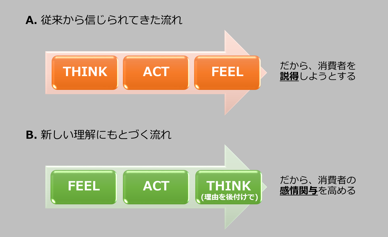 直感的に考えると、Aの流れのように、それらのアクションは何らかの考慮(THINK)の結果にもとづいて行われそうです。そのためマーケターは、そのアクションを起こしてもらうために、あの手この手で消費者を説得しようと試みるわけです。