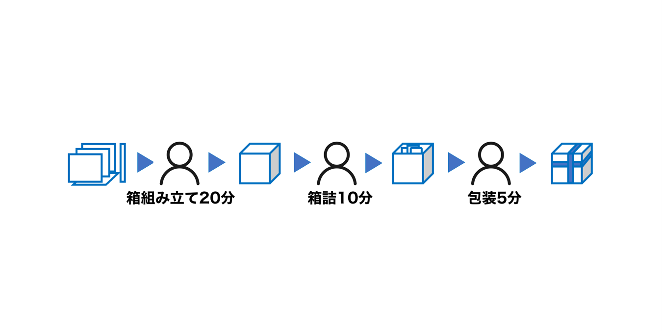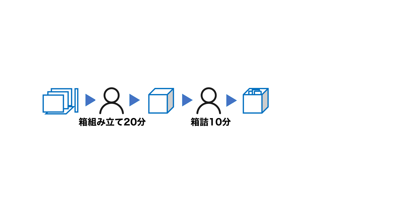 もうお分かりになった方もいらっしゃると思いますが、ボトルネックは「箱を組み立てる工程」です。この工程が20分から10分に短縮できれば、一時間に6箱包装まで完了することができます。生産性が2倍にまで引き上がるわけです。