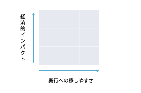 縦軸や横軸は、企業や案件の目的によって異なります。例えば、「経済的インパクト」が「顧客への影響」になる場合もあります。それぞれの目的に合わせてプライオリティ付けをしていければ良いと思います。
