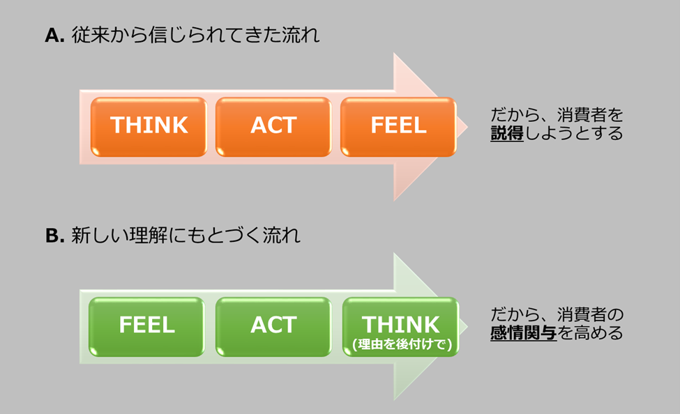 いつもは、AとBのうち、Bのほうが真実に近いと話をして、その中でも最初に感情(FEEL)が来る点を強調しています。しかし、ここではTHINKの前にACTが挟まっていることに注目してください。