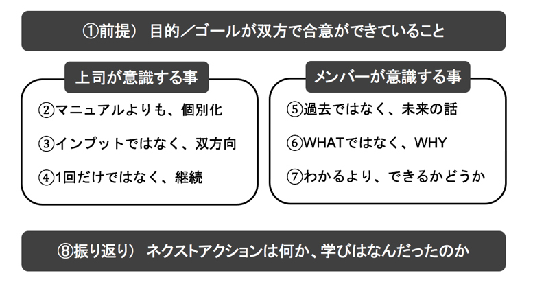 そこで今回は、私なりに考える「良い1on1と、ダメな1on1の違い」を考えていければと思います。まず次の図をご覧ください。ここでは組織内の「上司」と「メンバー」で意識するポイントを8つに分けました。一つひとつ考えていきます。