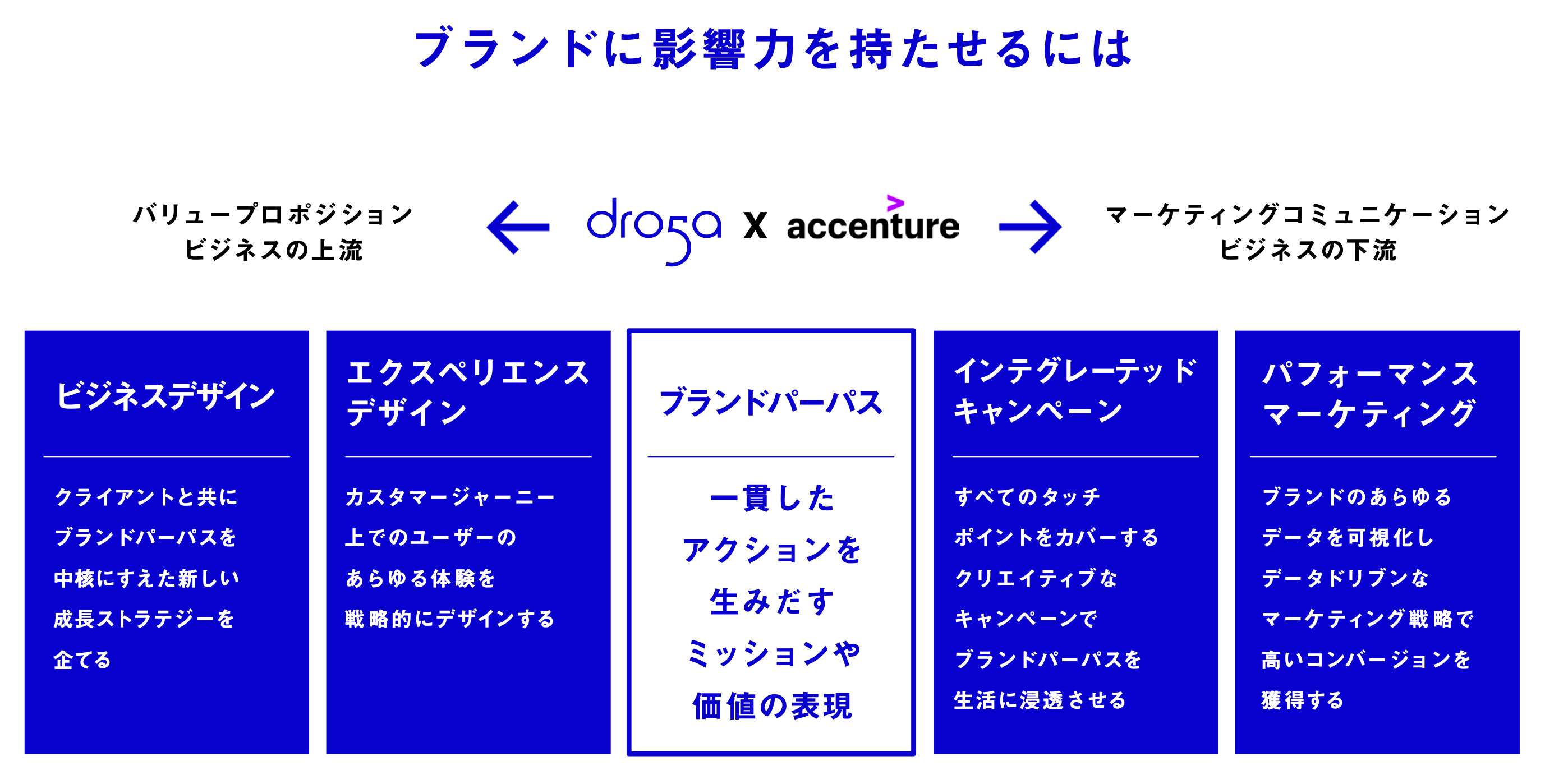 Droga5では、図の右側にある「パフォーマンスマーケティング(デジタルアドなど、データを活用して効果を高める施策)」や「インテグレーテッドアド(フィルム、屋外広告、イベントなど様々なタッチポイントをカバーしてブランドを浸透させる施策)」に加えて、図の左側にある「エクスペリエンスデザイン」や「ビジネスデザイン」の領域にも注力します。ここは、特にアクセンチュア インタラクティブと密に連携しています。