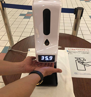・消毒一体式赤外線温度計による入場時の体温測定と手指消毒