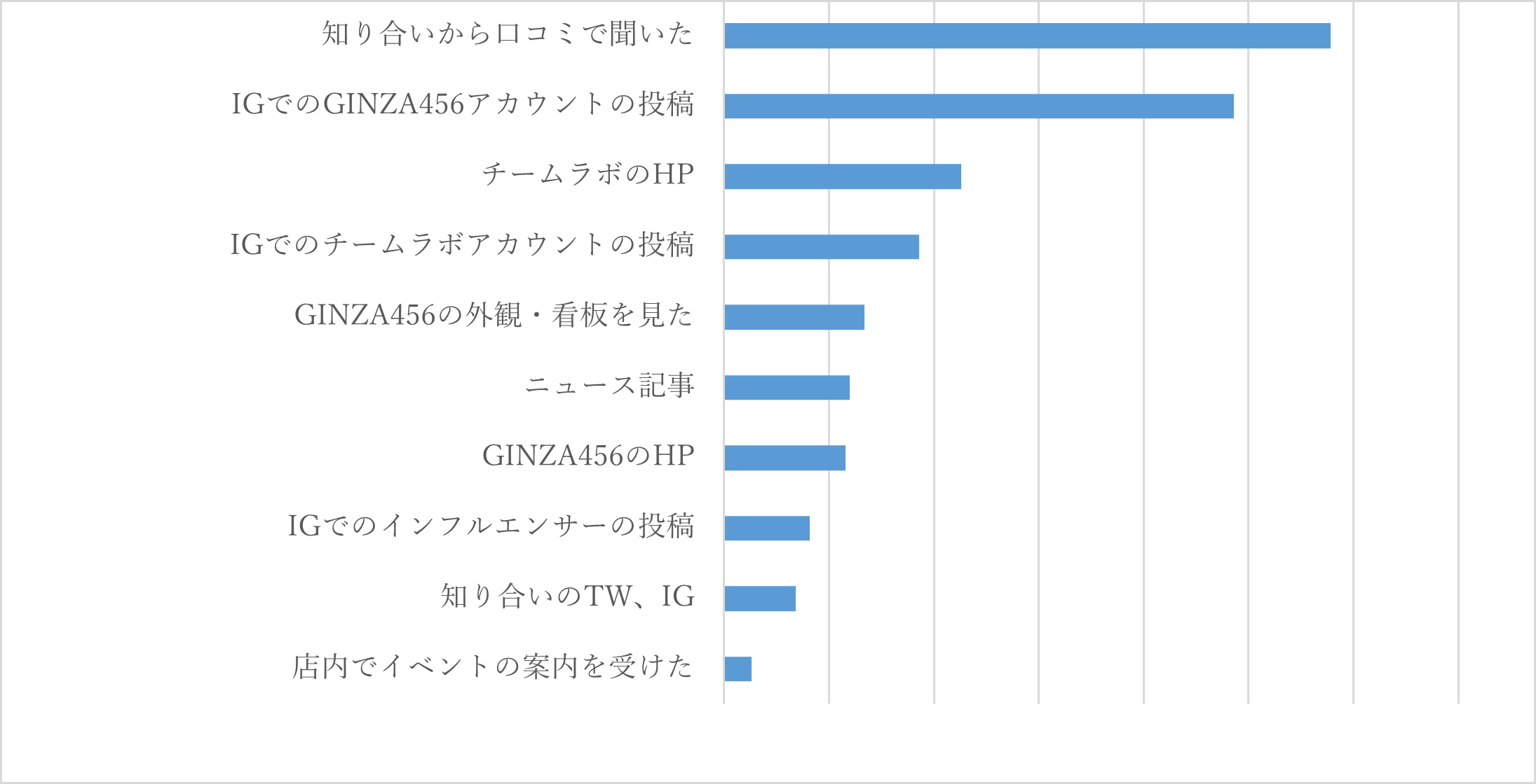 その結果、期間を通じた体験者の認知経路は「知り合いからの口コミ」「Instagramアカウント」が圧倒的に多い結果になり、体験いただいた方にもInstagramを始めとしたSNSやYouTubeでたくさん体験模様を投稿いただきました。(お客さまの体験投稿は #GINZA456 などで検索いただければご覧いただけます)