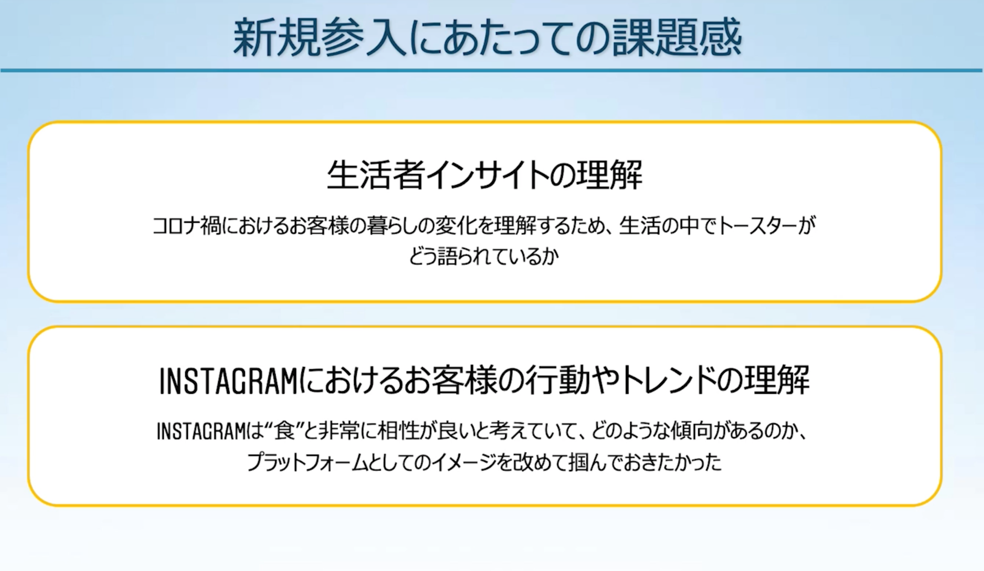 2つ目はInstagramにおける顧客の行動やトレンドにどのような傾向があるのかを理解したかったからです。特にInstagramは「食」というカテゴリと相性がいいため、プラットフォーム全体としてのイメージをこのタイミングで改めて掴んでおこうと思いました。