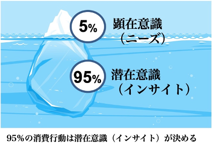 本人が自覚している理由や欲求、感情でなく、本人すら気づかない深層心理を見抜き、そこを手掛かりに顧客の心の周波数に合わせる。その結果、顧客の心を動かすことができるマーケティング戦略が実現します。つまり、マーケティングの成功は「心の理解」にかかっていると言っても過言ではありません。事実、私たち人間の95%の消費行動は「潜在意識」であるインサイトで決まっています(鹿毛康司・著『「心」が分かるとモノが売れる』)。