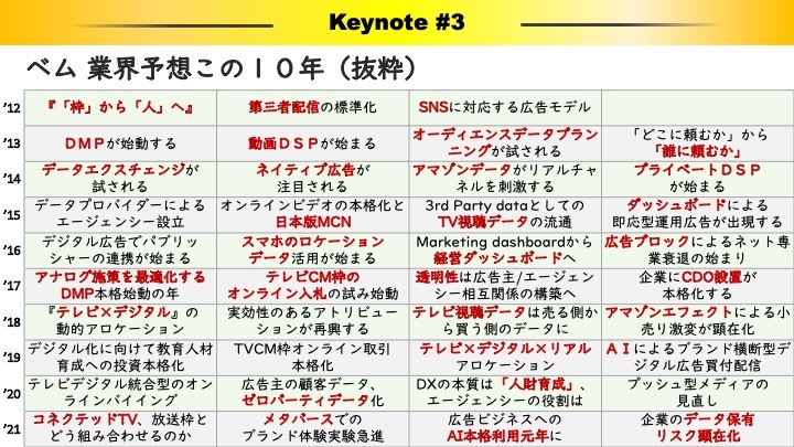横山氏が運営する「業界人間ベムRELOAD」は、マーケティング業界で働いている人が注目しているブログのひとつで、毎年1月にその年の業界予測をしています。この10年をまとめたものがこちらです(赤字が 実際に潮流を捉えたキーワード )。
