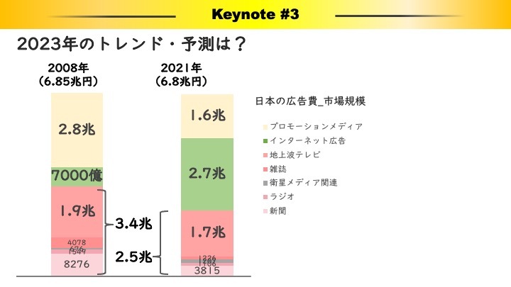 大きな潮流として2008年と2021年の広告費の比較と推移を、次のようにまとめています。