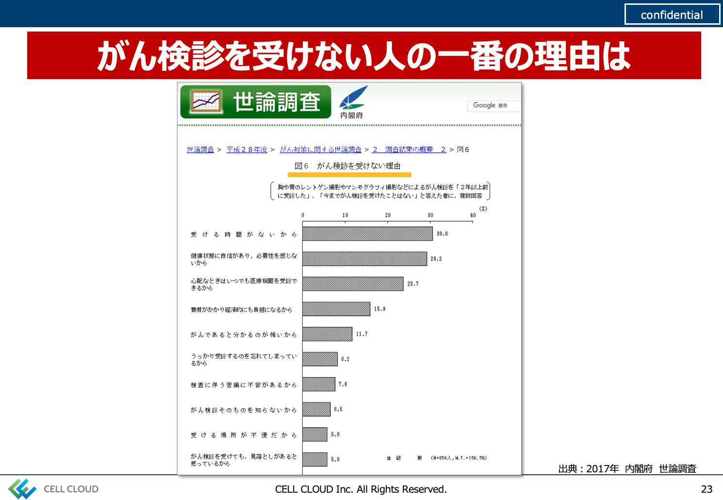 もちろん、結果に対する納得感や信頼感もあります。従来の遺伝子検査や唾液検査、尿検査、血液検査といった早期のリスク検査は簡単に受けられる反面、結果が曖昧で納得感がないといった課題がありました。その理由は、がんの人は「この遺伝子があるはず」「こんな因子が多いはず」など、間接的ながんの傾向値を測り、その値が高い=がんのリスクが高いとすることで、あくまでリスク指数を漠然と提示するにすぎませんでした。