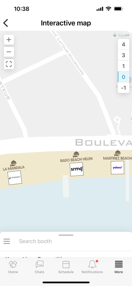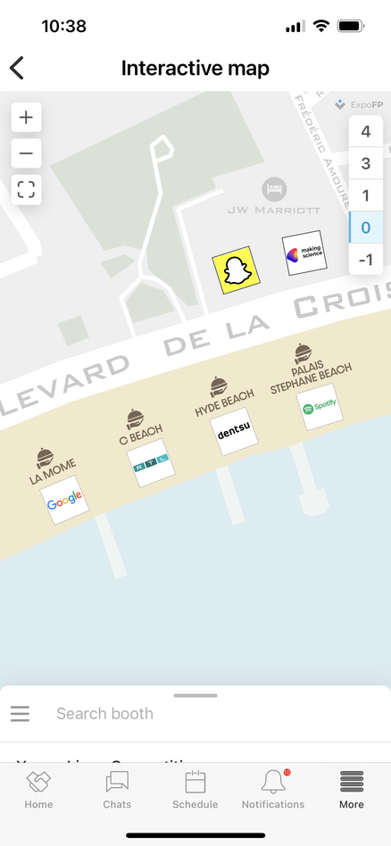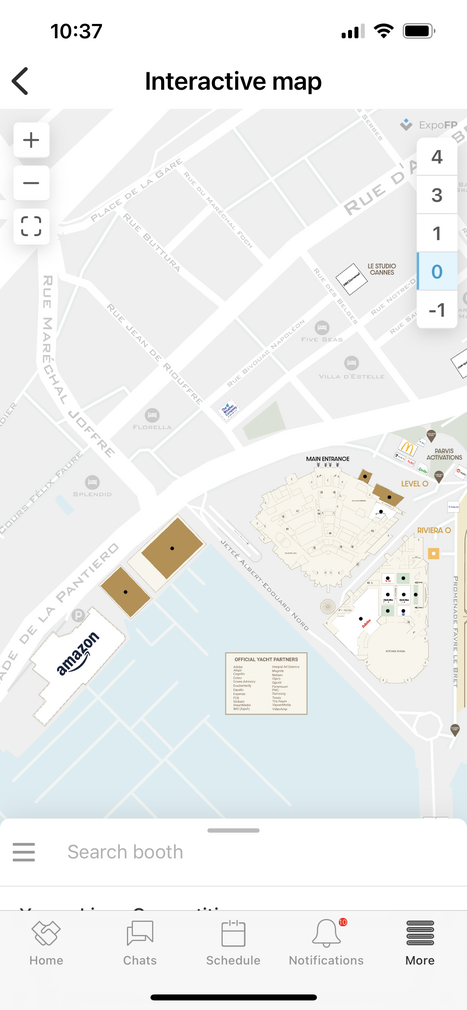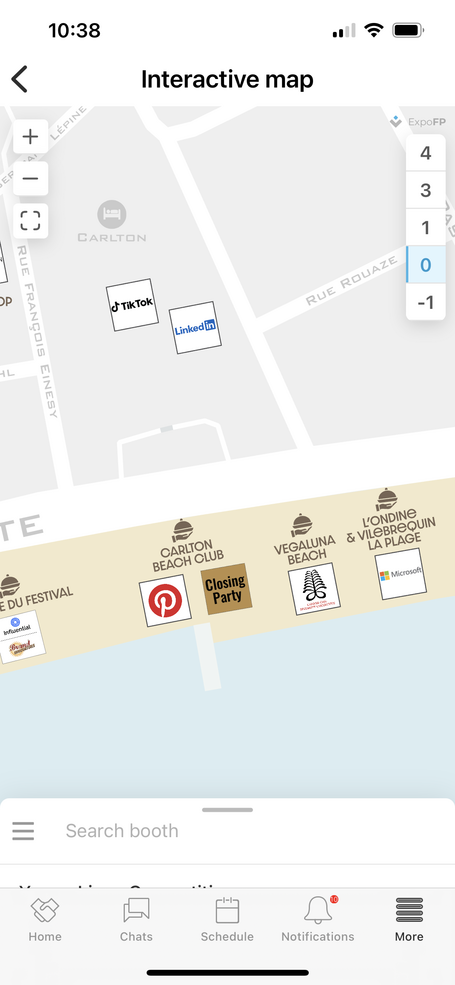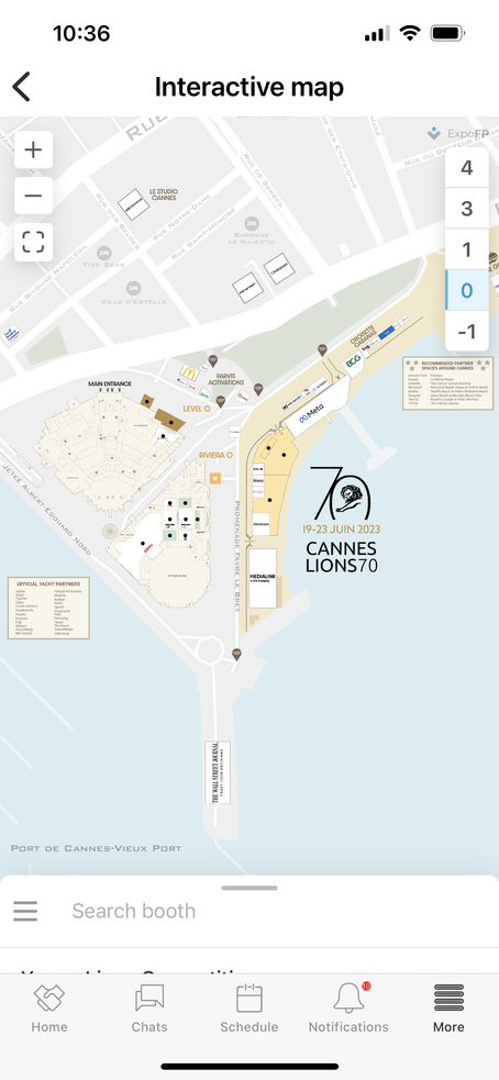 次の写真は、カンヌライオンズの現地参加者用アプリに載っていた資料です。メイン会場にいちばん近いところから挙げて行くと、Meta社、Google社、Spotify社、Pinterest社、Microsoft社、yahoo!社と名だたるグローバル企業のフリンジが、カンヌ随一の目抜き通りである「クロワゼット大通り」沿いを東(ニース方向)に向けて続いています。そして、比較的後発でこうしたスペースを持つようになったAmazonのフリンジは、会場から逆側のハーバー近くに位置しています。