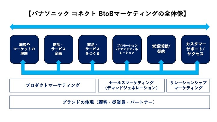 現在、パナソニック コネクトでは3つの部門を担当しています。ひとつ目が直轄部門です。コーポレート部門で全社横断したマーケティングとして、社内のマーケティングのプロセスやシステム、デマンドジェネレーション(営業部門へと渡す見込み顧客の創出や発掘活動全般)、顧客接点の最適化などをセンター・オブ・エクセレンス(Center of Excellence:企業内で点在している優秀な人材や技術、ノウハウ、設備などをひとつの拠点に集約し組織化すること)で顧客接点をデータでつないでいき、ひいてはビジネスにつなげていく活動に取り組んでいます。