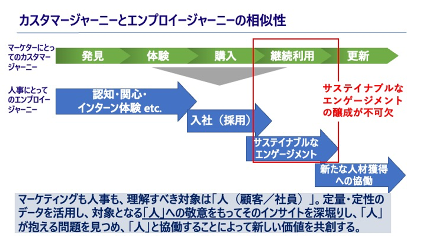 そこから、いかにエンゲージメントを醸成できるかが、これからの人事の肝です。そして、最近ではリファラル採用(社員から友人や知人などを紹介してもらう採用手法)のように、社員がリクルーターとなって人材を採用する動きも生まれています。マーケティングも既存顧客が新規顧客を連れて来てくれることがありますよね。やはり、人事とマーケティングはすごく似ていると思いました。