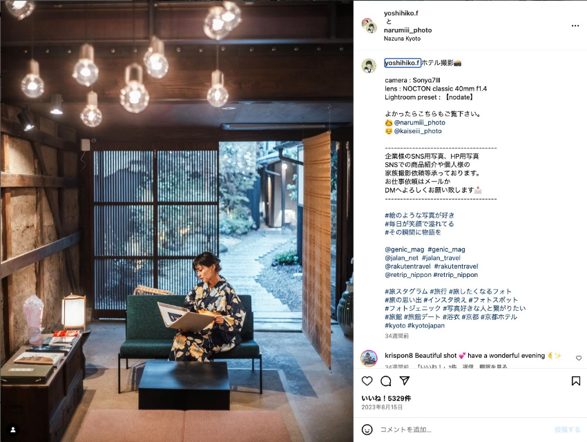 いろいろな人が来れば来るほど、さまざまな写真が投稿されるので、それを見て最終的に予約する人が多いのも事実です。実際、「Nazuna 京都」を利用する60%がSNS、特にInstagramの投稿を見て予約されているそうです。