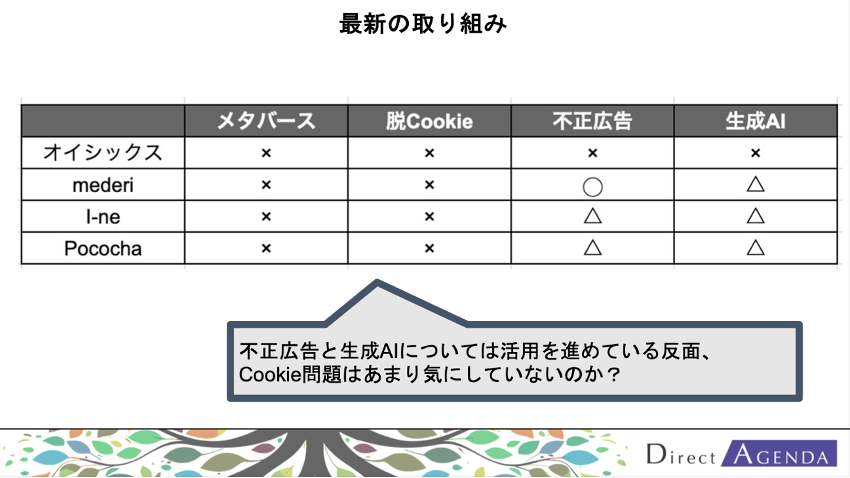西井 資料の最後に、生成AIなどを含めた最新の取り組みについて並べてみました。生成AIに本腰を入れて取り組まれている企業はまだないのが現状ですね。