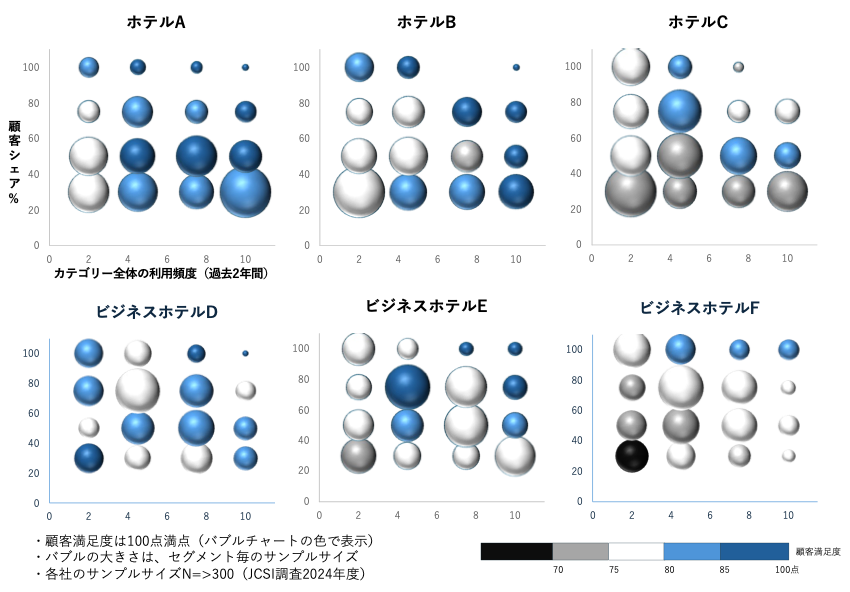 顧客シェアは、財布シェアだけではなく、「頻度シェア」として捉えることもできる。たとえば、小売店において極端に単価が高い商品を購入した人の財布シェアは高くなる。ホテルならばスイートルームに大家族で1週間連泊し、代表して決済している人の支払額は、出張でスタンダードルームに7回泊まった人よりも数倍高くなるだろう。そこで、図1では顧客シェアを金額ではなく、一定期間に何回、購買・利用を行ったかという「頻度」で捉える「頻度シェア」を用いている。一般に、あるブランドの利用頻度が高いほど満足度が高くなる傾向があるが、図1では、縦軸を頻度で見た顧客シェア(%)、横軸をホテルカテゴリー全体の利用頻度として、都市型ホテル3社とビジネスホテル3社の顧客基盤を16のセグメントに分解してバブルチャートの大きさと色で表している。バブルの大きさはサンプルサイズであり、CSI(顧客満足度)を青から黒まで5段階で色分けている。