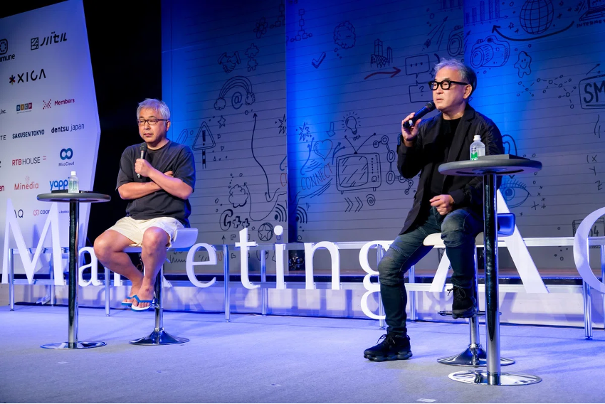 「マーケティングアジェンダ2024」(沖縄)のオープニングキーノートでセッションした足立氏(右)とPreferred Networks SVP最高マーケティング責任者の富永朋信氏。