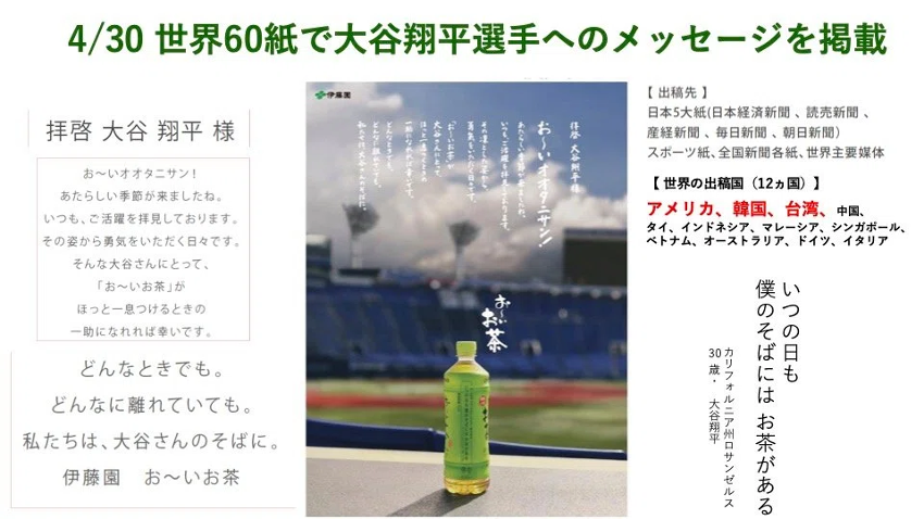 まずは、2024年4月30日に世界60紙で大谷翔平選手への応援メッセージを掲載します。ここで驚くのは、この広告にあえて大谷翔平選手の写真を使っていないどころか、あえて「お~いお茶」の正面のロゴが見えない状態で活用している点です。