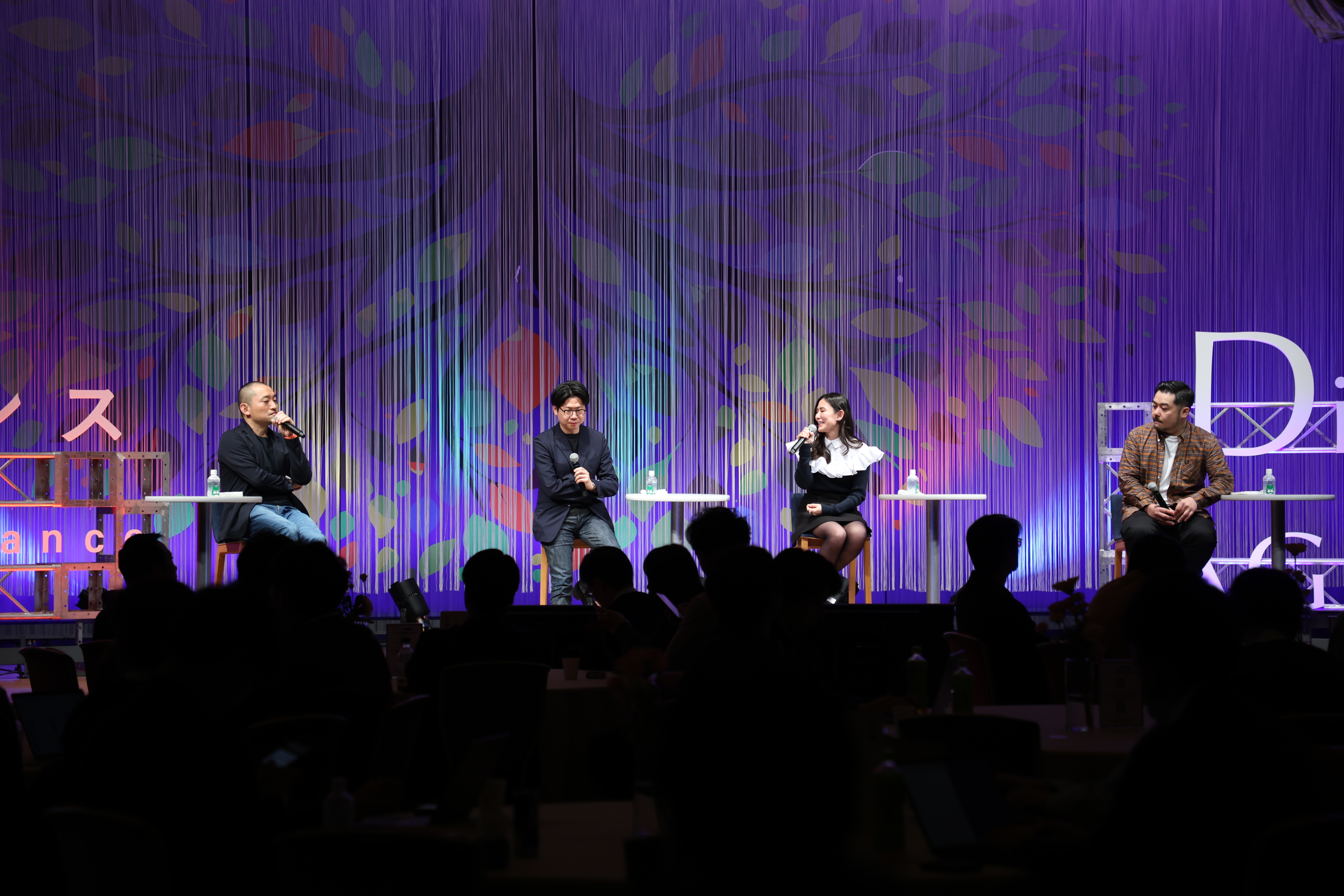 ダイレクトアジェンダ2024 のキーノートの様子。(右から)I-ne 伊藤翔哉氏、mederi 坂梨亜里咲氏、ディー・エヌ・エー 村口賢一郎氏が登壇し、モデレーターを西井氏(左端)が務めた。