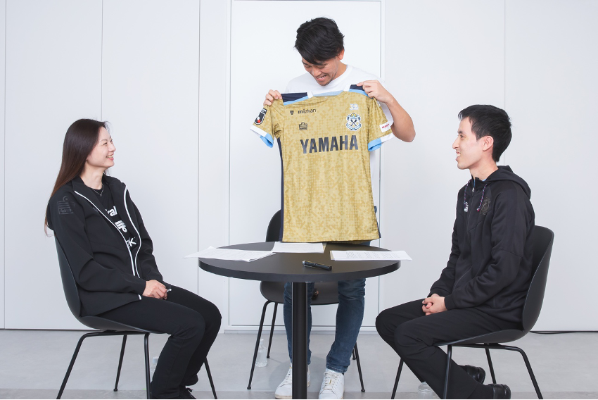 田中 2023年3月に正式にスポンサー契約を発表し、5月のサードユニフォーム解禁時には初めてジュビロ磐田さんのエンブレムとアドミラルさんのロゴと、ミツカンのロゴが同じユニフォームに乗り、ついに実現しました。ジュビロ磐田さんのファンがXで話題にしてから1年半近く経った念願の出来事でしたね。その初めてのユニフォームが、本日持参している金のユニフォームです。