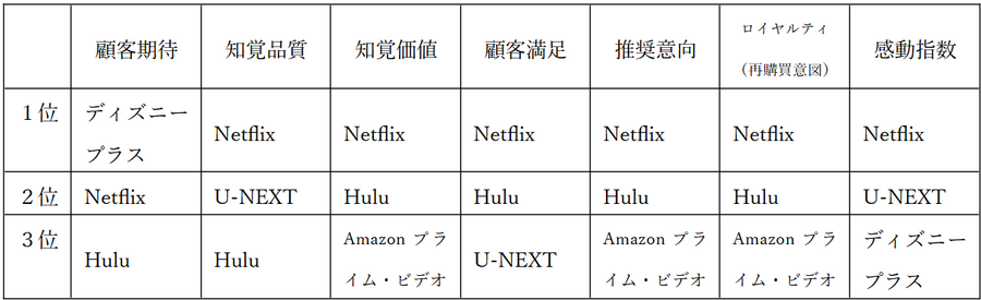 JCSI調査は、3ヵ月以上の利用経験などのスクリーニング条件を満たした回答者を、調査会社のモニターからサンプリングし、各社300件以上の有効回答を得た調査結果をもとに、顧客期待から感動指数までのスコアを100点満点で算出している。サービス産業を広く調査対象としており、今回の特別調査も他業種と同じ計算方法でスコアを出している。顧客満足で1位のNetflixのスコアは74.1であるが、エンタテインメント分野の宝塚歌劇団は82.5、劇団四季は81.4、東京ディズニーリゾートは78.3である。「楽しい」「嬉しい」「感動した」「興奮した」などといった感情体験がどれくらいあったかをスコア化した感動指数については、Netflixは60.7であるが、上記3つのエンタテインメント上位は75~76点であり、スマホなどの画面上でコンテンツを体験する動画配信サービスは、劇場やテーマパークでの実体験の顧客満足度に比べると、カテゴリー全体としてやや低い傾向があることがわかる。