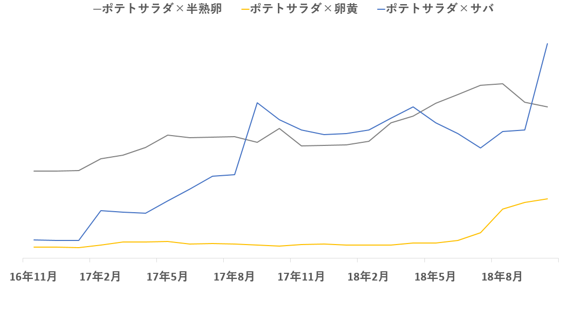 ポテトサラダはメニュー名に一緒に出てくる食材名を見ると「卵黄」や「半熟卵」といった触感をより滑らかにして濃厚な印象を与える食材や、クックパッド社が2018年の「食トレンド大賞」にも選んでいる「サバ缶」ブームを反映してか鯖が伸びている。