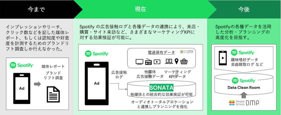 具体的には、Spotifyの広告接触ログと、電通が保有する各種データ(サイト来訪データ、購買データ、テレビ接触データなど)との統合分析により、テレビCMやラジオCM、デジタル動画広告など他の広告媒体とSpotify広告との比較分析や統合リーチ計測が可能になり、Spotify広告の効果を多角的に検証できるという。