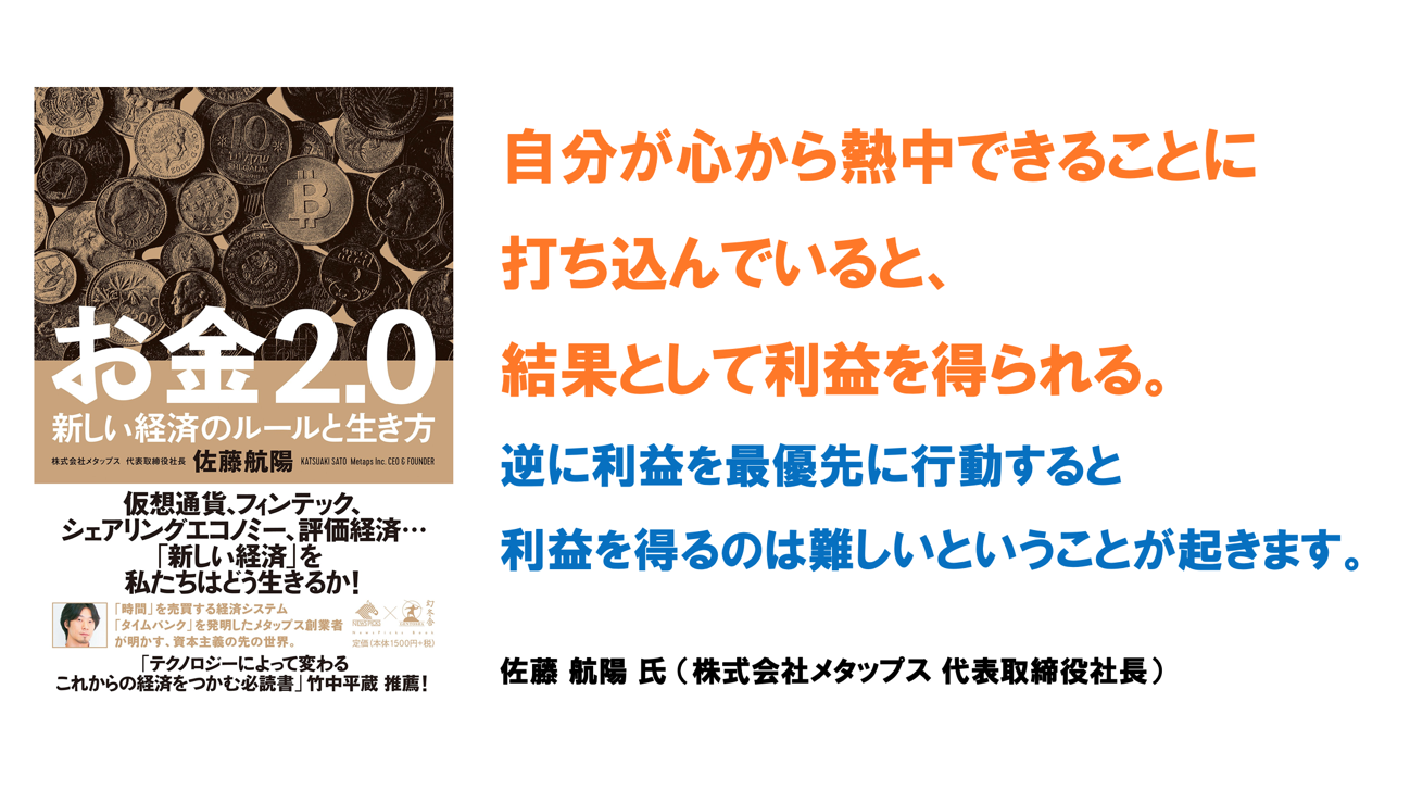 佐藤航陽氏の著書「お金2.0」の中にも、「自分が心から熱中できることに打ち込んでいると、結果として利益を得られる。逆に利益を最優先に行動すると利益を得るのは難しいということが起きます」という一節があります。個人的にも直感的にも経験的にもこの考え方に強く共感しています。サインコサインはセプテーニ・ホールディングスから100%出資を受けている会社ではありますが、これまでのキャリアも通じて私のことを誰よりも理解してくれている株主ということもあり、基本的には私が「熱中して打ち込むべき」と考えることを優先しながら、一定の投資を行うこともできています。