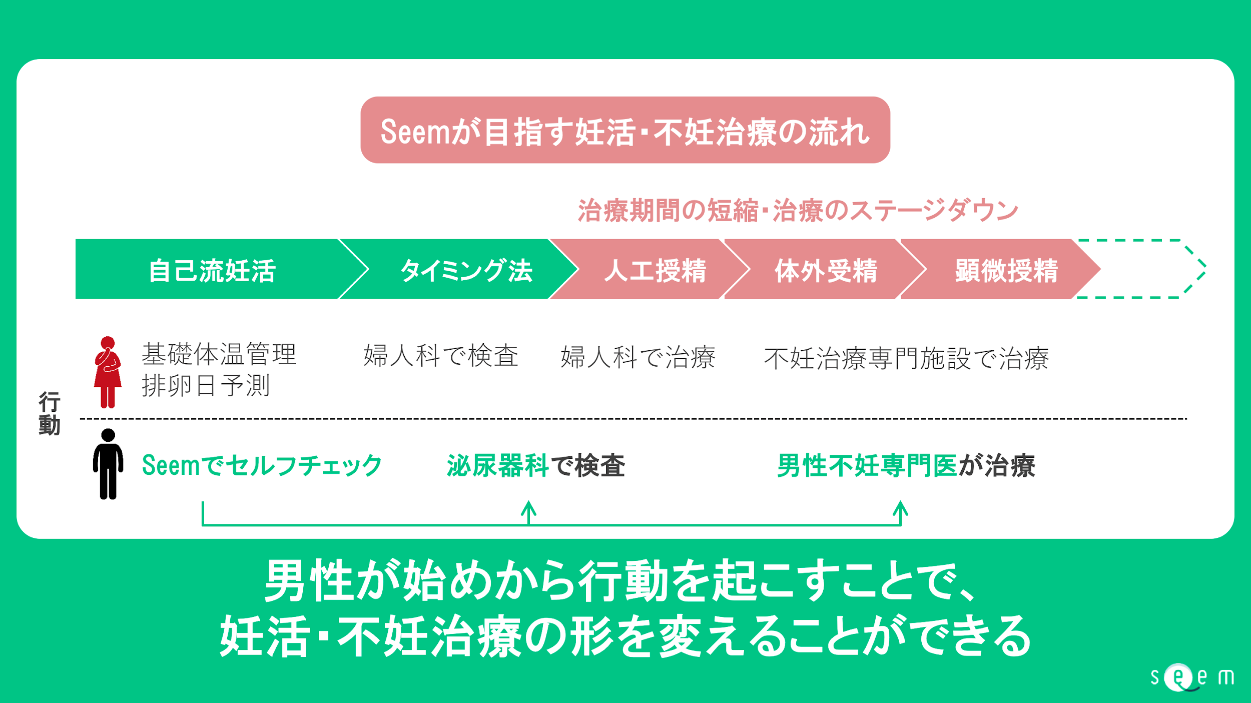 妊活のはじめから男性が行動を起こせるようにすることで、妊活・不妊治療全体の流れを変えるとともに、「妊活は男女ふたりで取り組むもの」という新しい文化をつくっていきたい。