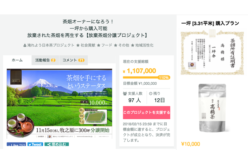 昨年行ったクラウドファウンディングでの取り組みは目標金額に達成し、ちょうど昨年の今頃、様々な名前のついた「自分のお茶」が全国の支援者に届けられた。支援者からもたくさんの喜びの声や応援のメッセージが届いた。またクラウドファンディングを利用することで「放棄茶畑の問題」「急須で淹れる日本茶文化の低迷」を多くの人に知ってもらうこともできた。