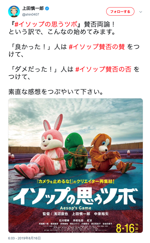 徳力 現在、公開中の映画『イソップの思うツボ』では、良い意見だけでなく悪い意見も言ってもらえるように「#イソップ賛否の賛」と「#イソップ賛否の否」という2つのハッシュタグをつくっています。わざわざハッシュタグをつくってまで、否定的な意見を集めてしまう人を初めて見ました(笑)。