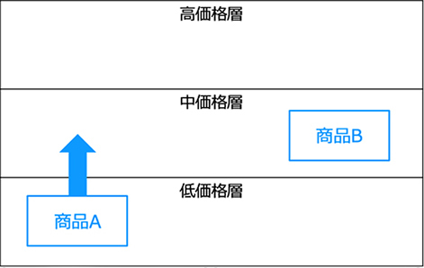 例えば、主に高中低価格で分かれる市場を想定してください。「安さ」が特徴的な低価格層商材Aが単価を上げて中価格層に移行したいなら、「安さ」の参照点で選ばれるだけでなく、「付加価値」の参照点で選ばれるようにしなければいけません。