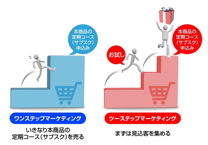 20年ほどダイレクトマーケティングに携わっている私が一番もったいないと思っているのが、モールでは「ツーステップマーケティング」ができないことだ。「ツーステップマーケティング」というのは、「無料モニター」や「100円モニター」を入口として、本商品の定期コース(サブスク)にアップセルさせる(引上げる)ビジネスモデルである。