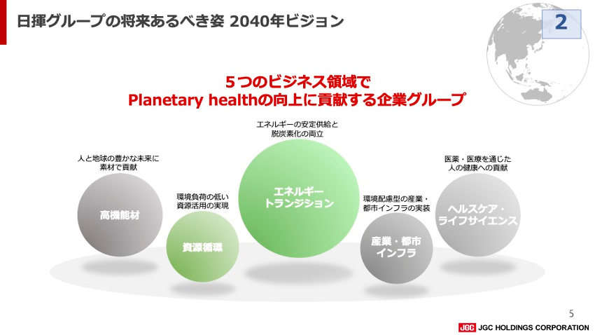 2040年までのスパンを、最初の5年を挑戦、その後の5年を収穫、その次を飛躍の5年と称して、中期的な計画をこれから展開していくところです。また日揮グループのパーパスを「Enhancing planetary health」と再定義しましたが、今日の組織の中でこれを知らない社員は誰もいませんし、日揮グループにとっては近く親しみやすい言葉だと思っています。