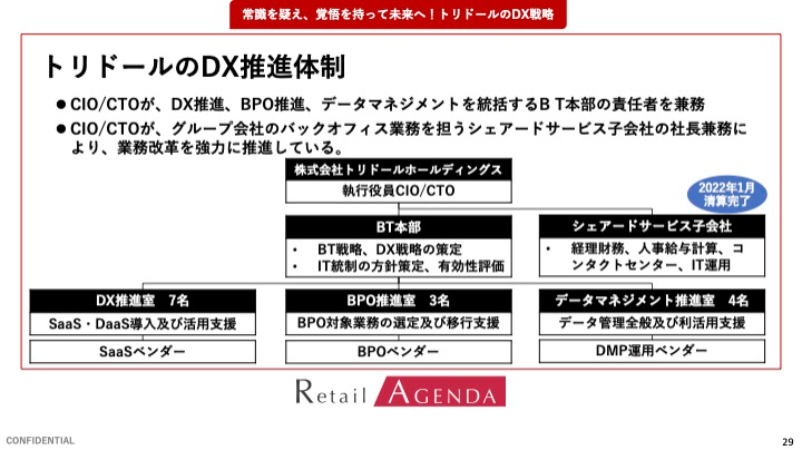 それからDXの推進体制については、CIO/CTOがDX推進、BPO推進、データマネジメントを統括するBT本部の責任者を兼務し、グループ会社のバックオフィス業務を担うシェアードサービス子会社の社⻑も兼務することにより業務改革を強力に推進しています。