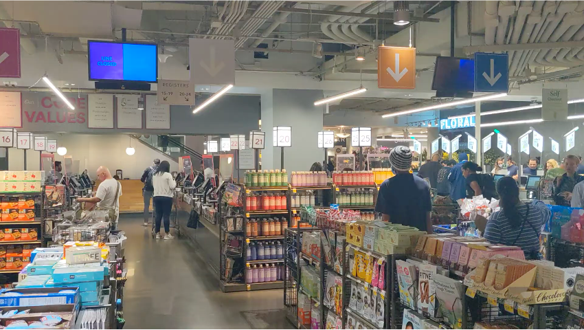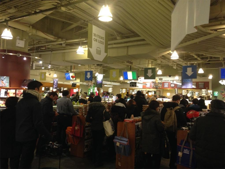 筆者がニューヨークで定点観測する店のひとつが、マンハッタンにあるホールフーズのコロンバスサークル店です。ホールフーズにしてはコンパクトですが、夜間でも大勢の来客がある人気店です。有人レジが30台あっても、常にレジ待ちができています。