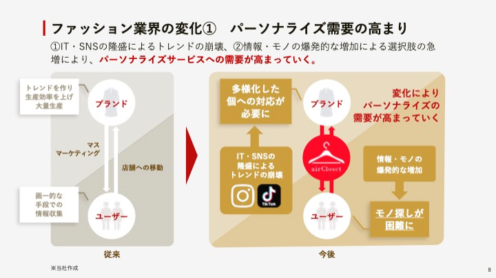 一方で消費者も、自分に合うものを探そうとしたときに、対象のモノや情報は増えているのに使える時間は変わらないので、相対的に時間が足りず、結果的に新しいファッションやブランドとの出会いが限定的になってしまっています。つまり、先ほど話した「相対的に時間の価値が高まっている」ということです。それに対してairClosetは、新しいファッションやブランドに出会える仕組みを提供しています。