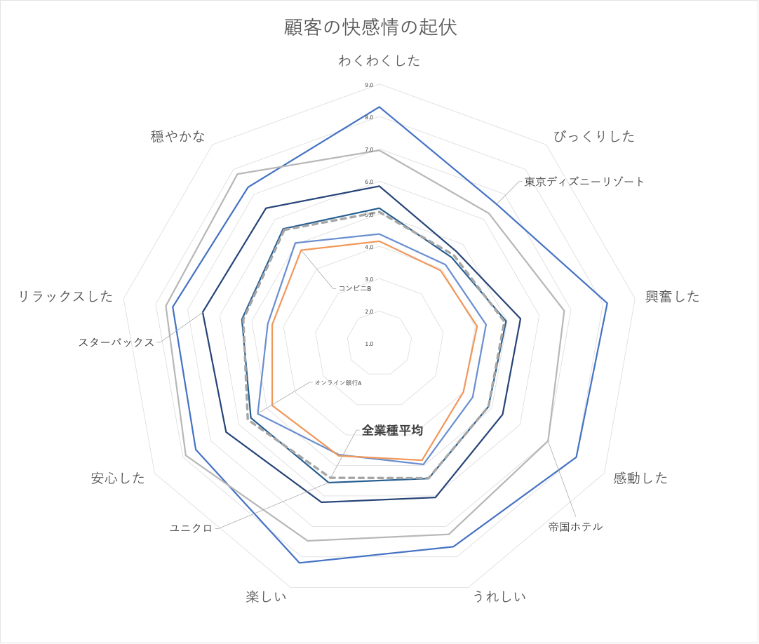 上図のレーダーチャートは、特定ブランドのユーザーに各種の感情をどの程度経験したか(「全くない」~「毎回」の10段階)を質問した調査結果を示している。これは日本のサービス産業を業種横断で継続的に調査しているJCSI調査(日本版顧客満足度指数:サービス産業生産性協議会)の2023年度データである(※)。