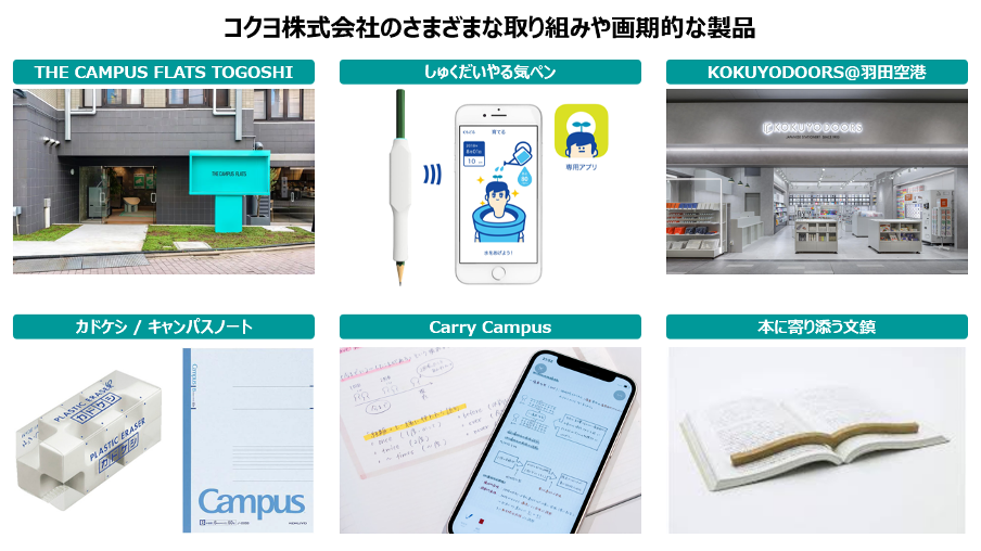 ただその前に、コクヨのユニークな製品について簡単にご紹介させてください。「キャンパスノート」は誕生したとき、紐で綴じない製法が画期的だったと聞きます。「THE CAMPUS FLATS TOGOSHI」は、最近東京に展開された実験的な集合住宅ですね。「しゅくだいやる気ペン」はアプリと連動してお子さんのやる気を促すIoTアイテムです。「本に寄り添う文鎮」も、最近出された商品ですが、なかなか渋くて面白いと思いました。