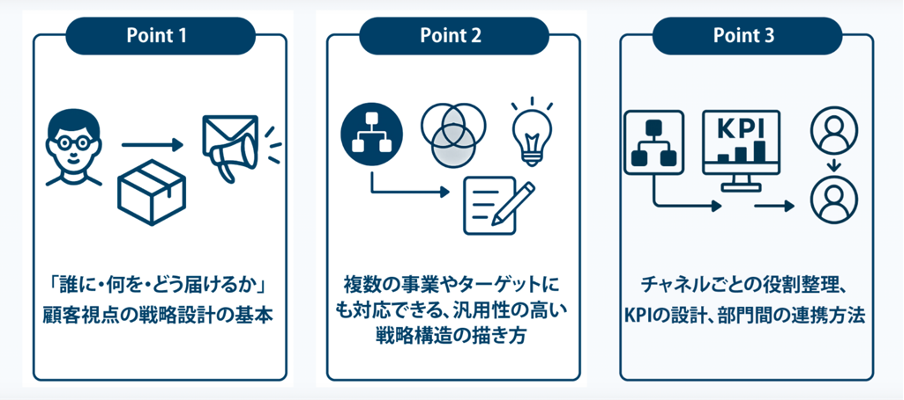 講座の中心となるのは、短期と長期、営業とマーケのKPIを一貫して整理する「Blue Print(戦略設計書)」の構築だ。マーケティング初心者でも取り組みやすいステップで、以下を実践的に学ぶ。