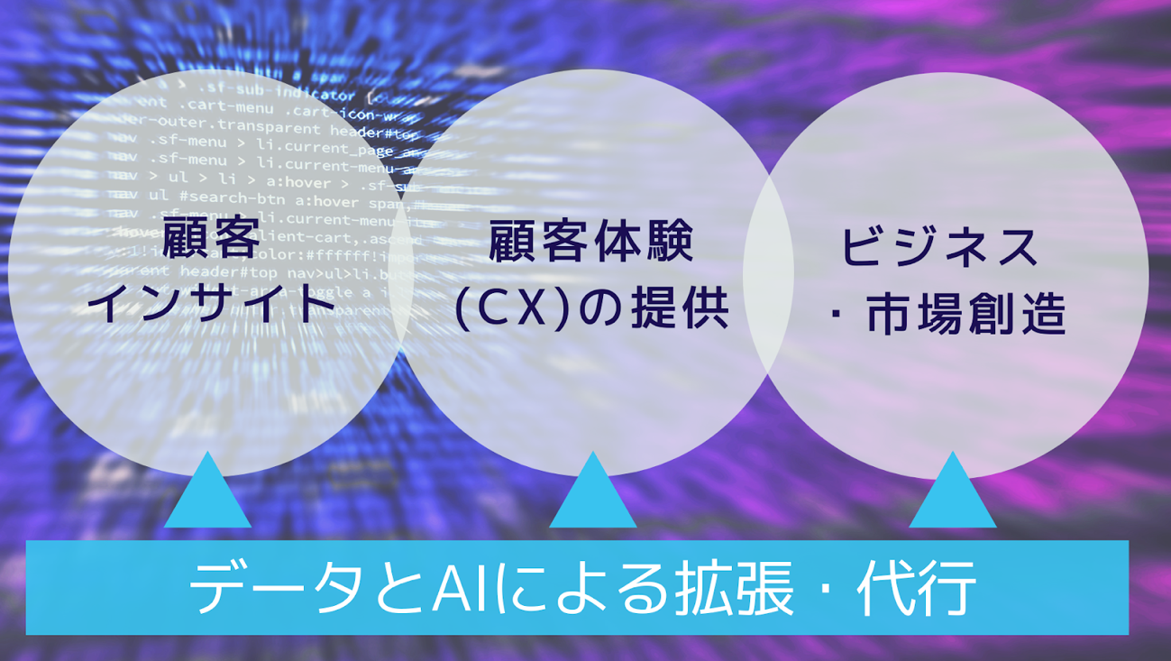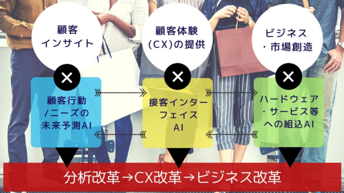 「顧客インサイト」「顧客体験(CX)の提供」「ビジネス・市場創造」に、3つのタプのAIを適応させていくことで分析改革、UX改革、ビジネス改革をもたらす図を用意したのでまずは見ていただきたい。