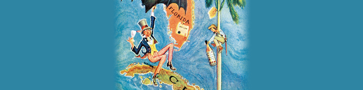 アメリカの象徴であるアンクルサムがグラス片手に黒いコウモリにつかまってフロリダ半島からキューバに向かい、キューバの地ではココナッツの木につかまった男性がバカルディラムのボトルを抱えています。「お酒を飲むために、キューバに旅行しませんか」というキャンペーンを仕掛けたのです。